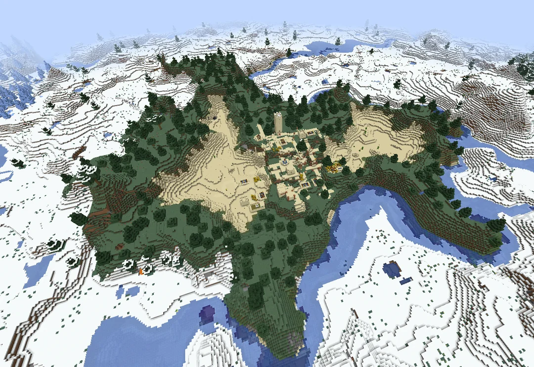 Start your journey in a stunning winter wonderland with towering ice spikes and snow-covered peaks. This amplified world creates dramatic mountain ranges and frozen landscapes perfect for building ice castles or creating your own Frozen-inspired kingdom. The unique terrain generation in amplified mode transforms this seed into a photographer's paradise.