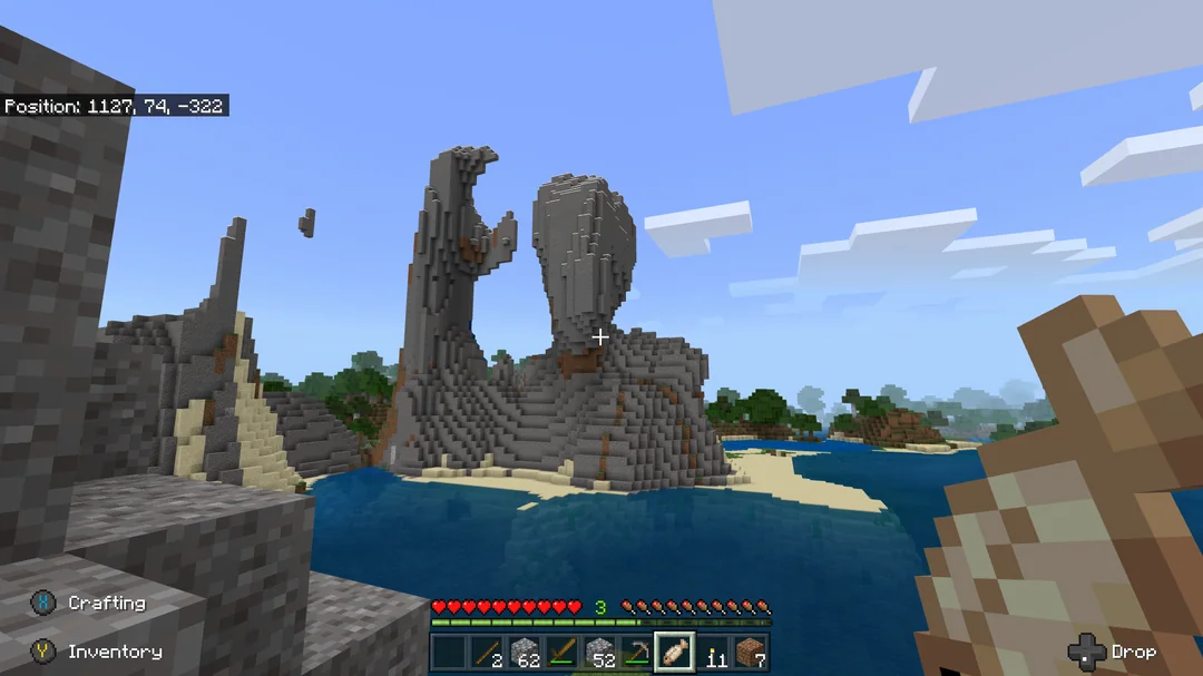 This seed generates a mysterious stone figure that looks intentionally crafted by ancient builders. The natural formation creates an atmospheric starting point for lore-based gameplay.