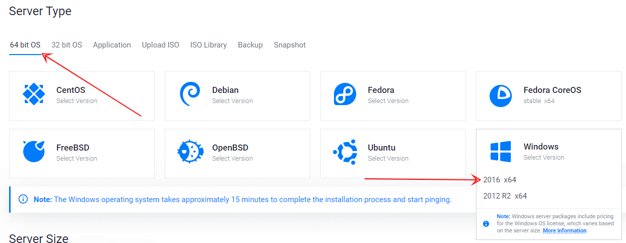 The next thing we need to do is select the server type. It should automatically have "64 Bit OS" selected, if not, do that now. Out of the 8 options that are on the screen, select "Windows". Once you click that, it will give you 2 options. Select the top one "2016 X64".