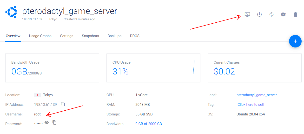 Once you have these credentials, click the "Open console" button in the top right. This will open a terminal window, providing direct access to your server.