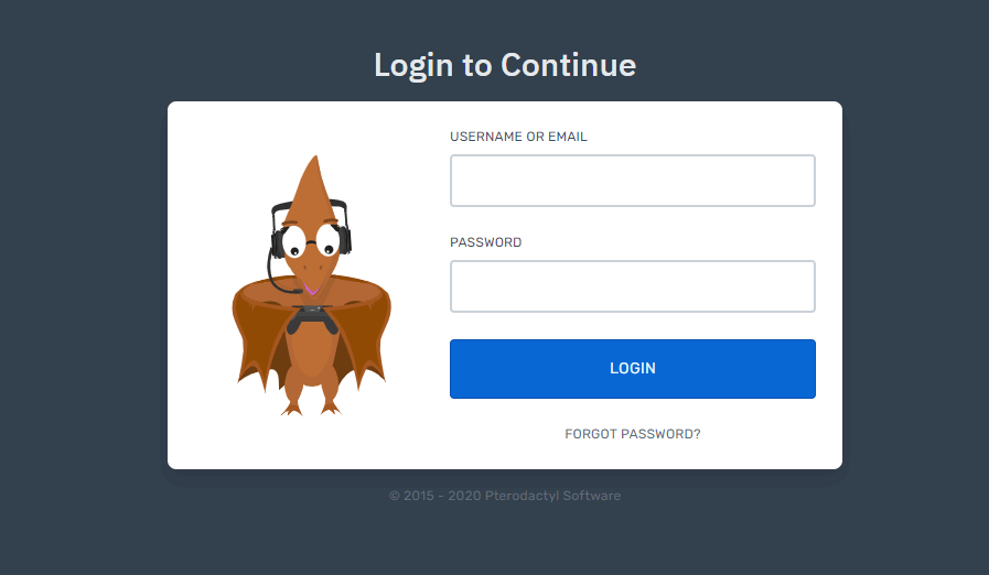 The initial load may take about 10 seconds, after which you should see the Pterodactyl login screen. If the login screen does not appear, an error may have occurred during installation. Please screenshot your console output and seek assistance in the #tech-support channel on our Discord server.