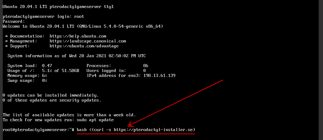 Once you have logged into your server's console, you can run the Pterodactyl installation script.