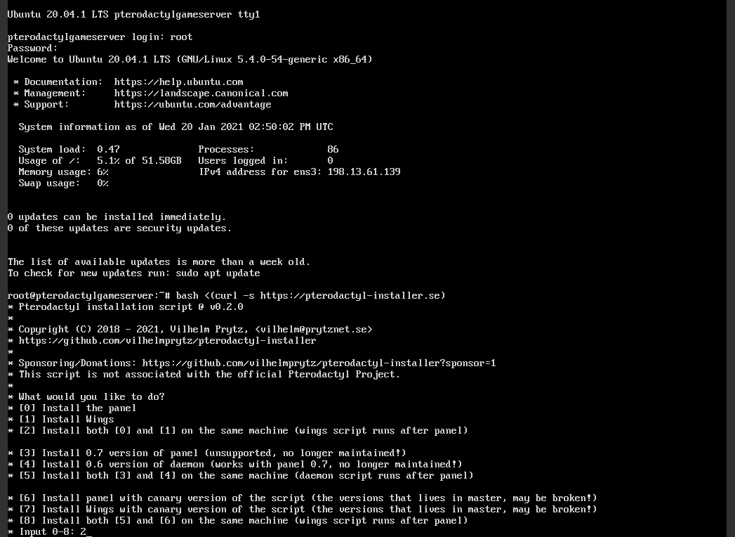 The script will prompt you for installation options. Select option 2 to install both the Panel and Wings.