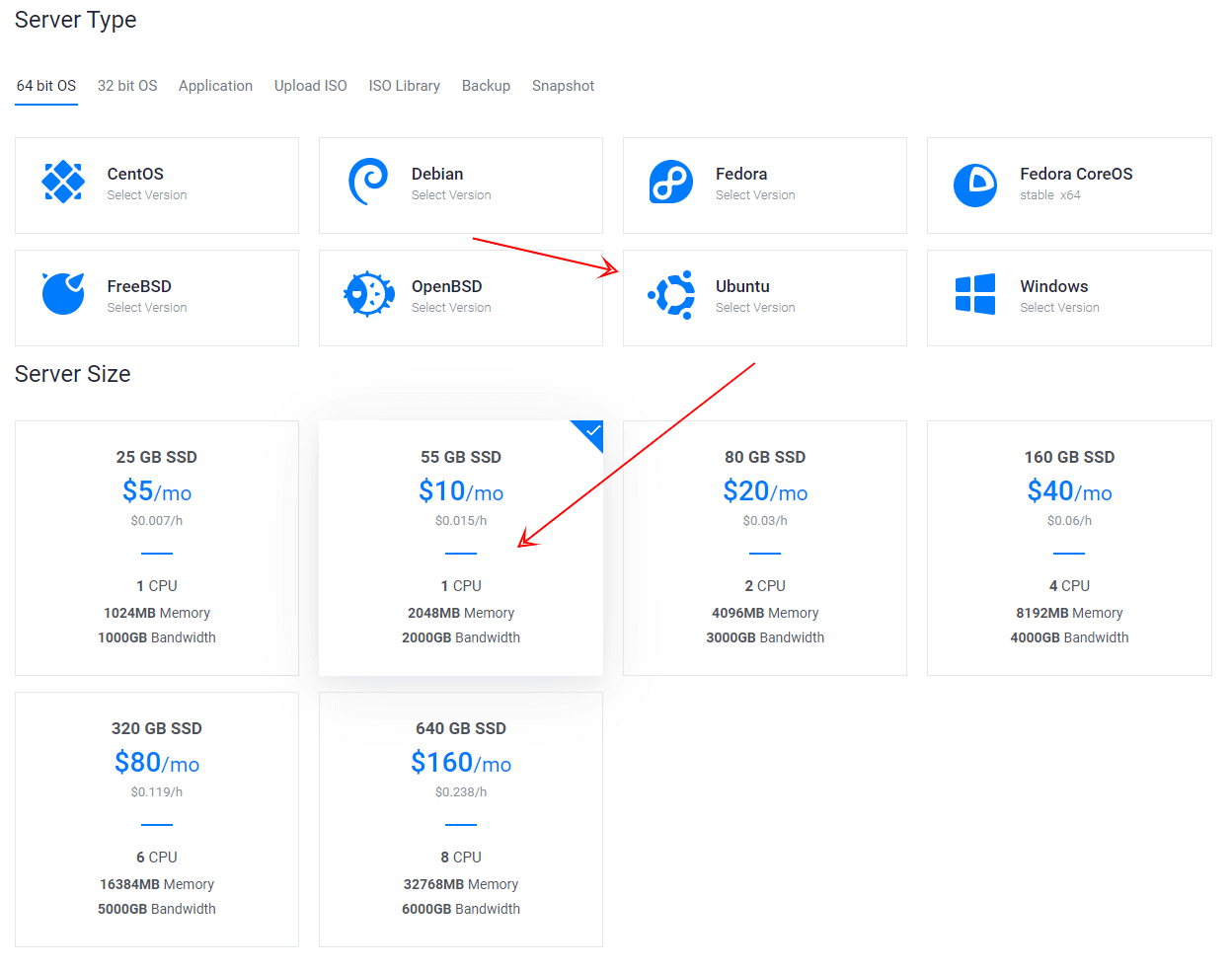 Next, select the operating system for your server. Vultr refers to this as "Server Type". At the time of writing, we recommend selecting Ubuntu 22.04 (or newer LTS versions like 24.04 if available), as it offers Long Term Support and works well with the Pterodactyl installation script.