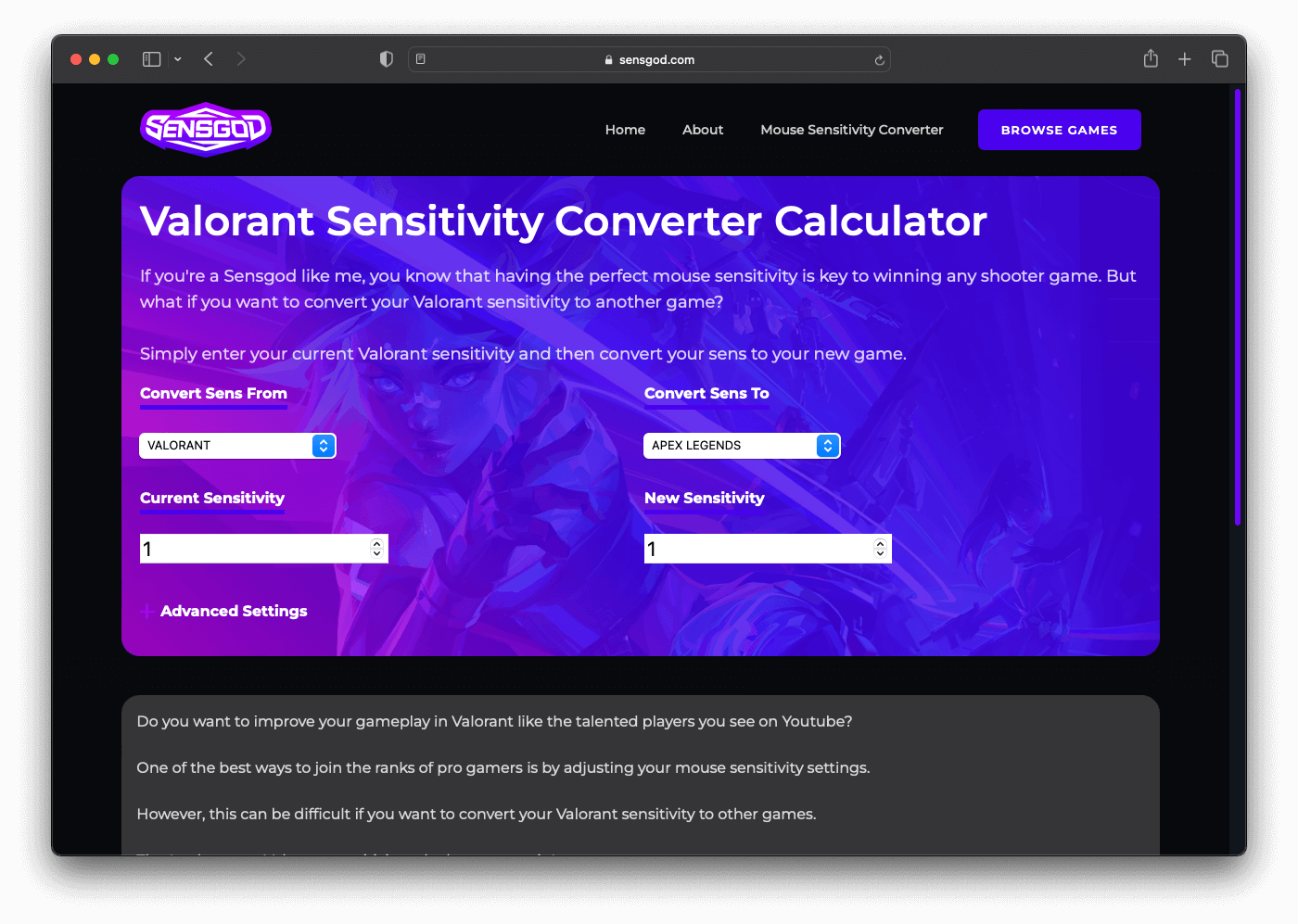 Sensgod is a free mouse sensitivity converter that supports a wide range of games. It's a simple yet effective tool that allows you to convert your sensitivity from one game to another. The website has a clean, user-friendly interface that makes it easy to use.