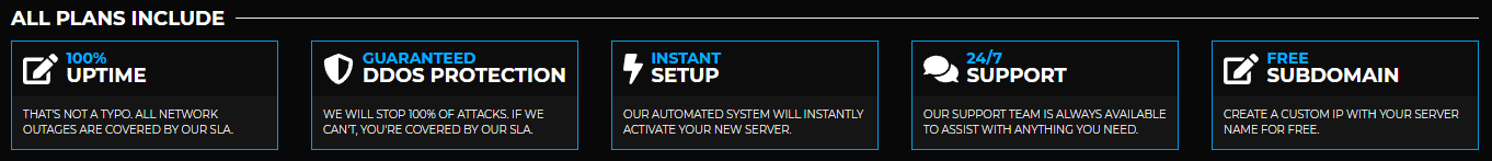 Each plan includes 100% uptime, guaranteed DDoS protection, instant setup, 24/7 support, and a free subdomain. Here's an overview of their plans: