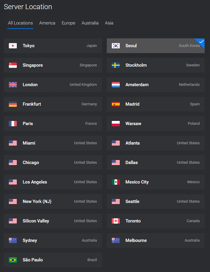 Once you have decided what server is best for you, it comes time to select a data center. Generally, you'll select the server closest to your target audience, as this will give you the best performance.
