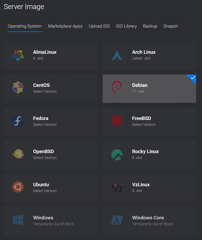 After this, you can select either your server operating system or the application you want to run. Vultr offers One-Click Installs for lots of common applications (and games servers such as Minecraft).